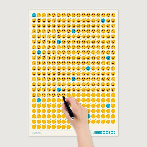 Now, thanks to BrigadaCreativa’s Etsy store, emoticons have jumped off the computer screen and into our daily life at home. This Life Calendar below asks the question, “How was your day?” Each day of the year, you can fill in the yellow circle with a little illustration of how you feel. Although there are probably an endless number of emoticons we could create, the directions with the calendar suggest choosing one of these five: very good, good, regular, bad or very bad.