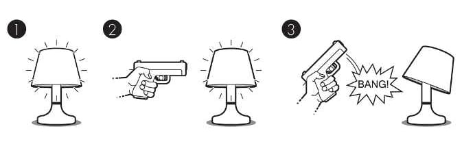 It is called the BitPlay Bang! Lamp. This lamp is available for purchase on Dynamism for $299. The lamp is currently only available in white, and it stands about a foot and a half tall. It is battery operated, and only takes 1 light bulb. The remote control gun is made of metal and works within a 15-foot range of the lamp. After you shoot the lights on, the lamp shade will tilt backwards to reflect being shot. Shoot it again and the shade will restore itself to its original state.