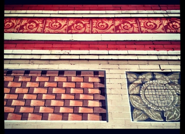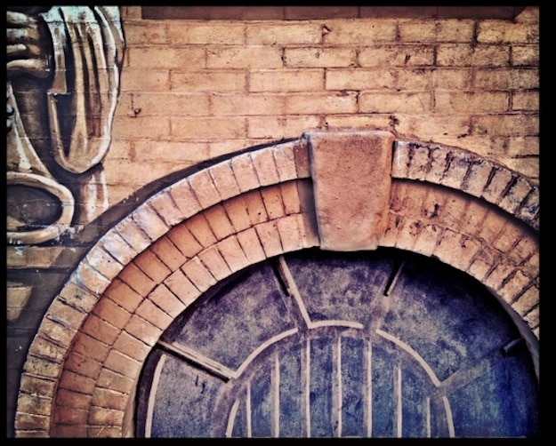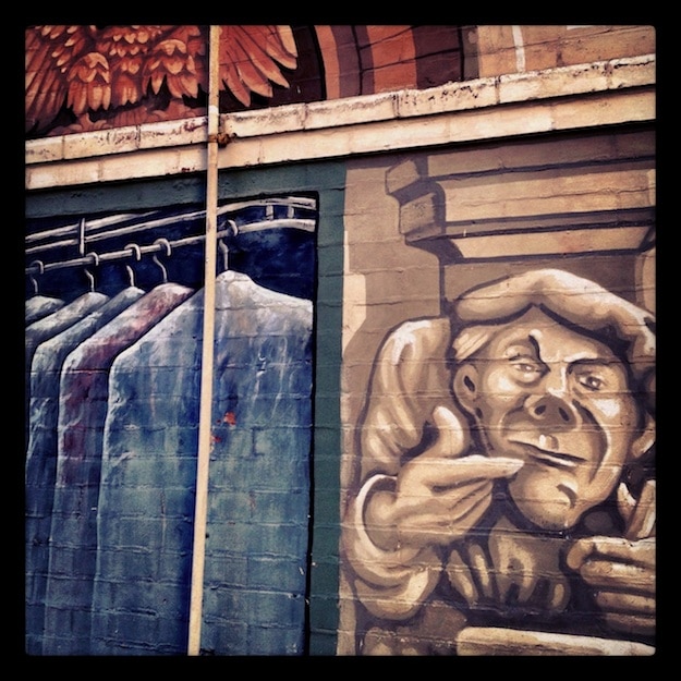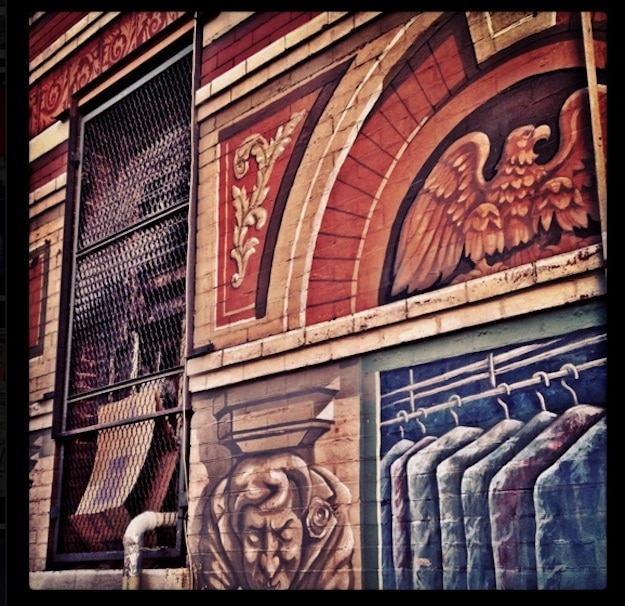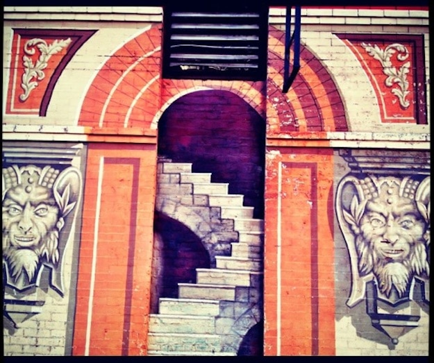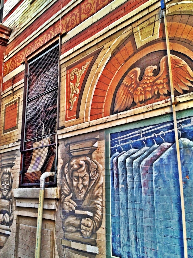 So yes, in every way this was just a building with a mural, but it’s so strange to find such lovely artwork existing anonymously in the world, seemingly invisible to the people who walk by without glancing up. Where did it come from? Who painted it and what does it mean? It almost felt like the building, stuck in the same place for so long, began to grow a fantasy like a second skin or a new layer of paint. Textures of twine and faux-engraved detailing peacefully clashed with painted brick, swirled arches, conflicting personalities, ghouls playing instruments and monster tailors guarding painted garments and stairs – some real, some painted on – leading to nowhere.