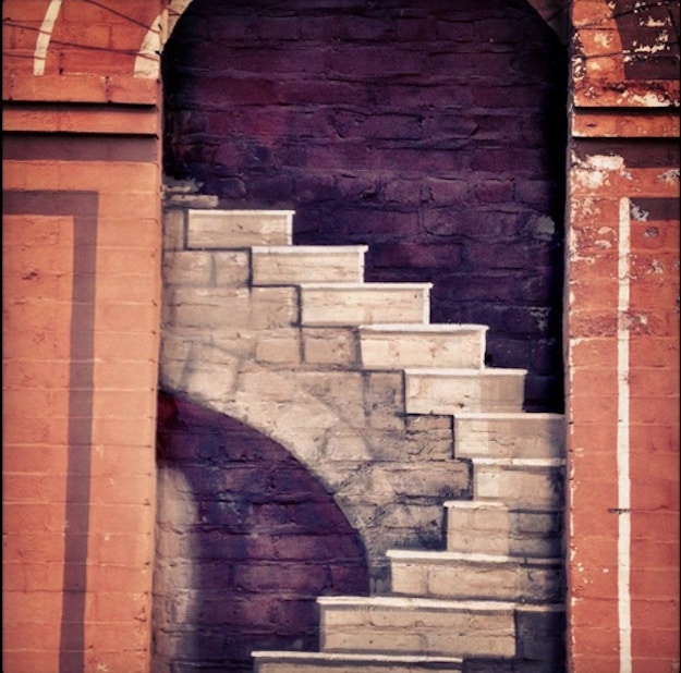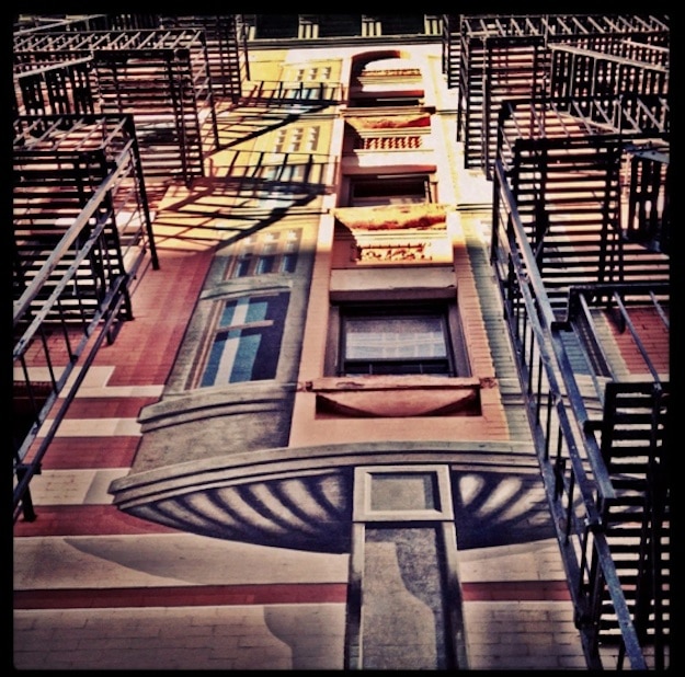 Since I’m an iPhone photo app geek, I snapped the building for a while, waiting for the painted stairs to materialize and take me to some other world. Maybe this street art mural was the building’s daydream of Dungeons and Dragons, or maybe this demon building was just singin’ the blues. The mural depicted a mess of gorgeous imagery, giant fake clocks, mechanisms so large, I felt like I could walk through them when they failed to clang or tell the correct time, idly soaking up the afternoon sun, frozen in time and flattened along the facade of the building. The mural was stunning and it reminded me that beauty is everywhere. Alternate realities exist. Some buildings daydream in game symbols, and these unexpectedly expressive game board murals, artistically rendered but oddly marginalized, are often ignored.