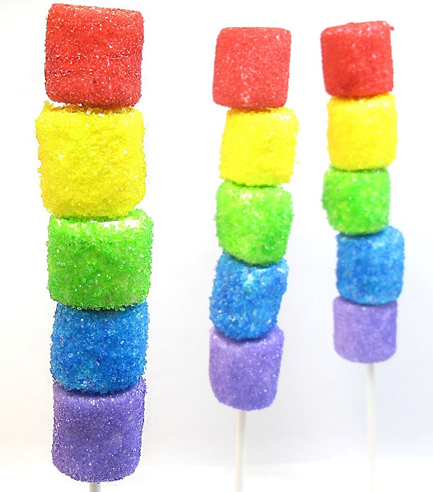 It’s a happy sunshiny day here in Atlanta, and I couldn’t let it pass by without giving all my fellow foodies a fun, colorful dessert idea. Sometimes it seems like the best things in life are discovered by accident. Just like silly putty, post-it notes and the slinky, these sparkly rainbow marshmallow kabobs are the result of some other recipe gone wrong.