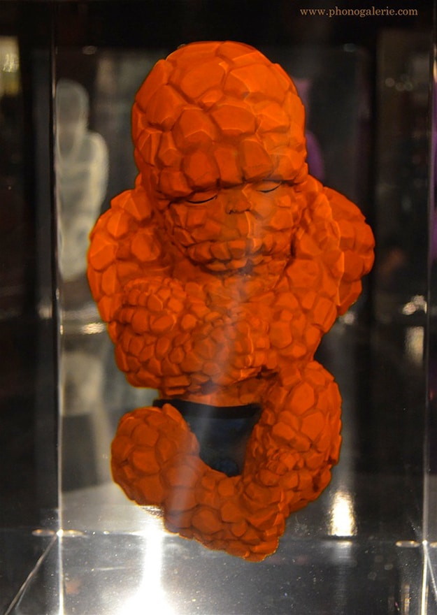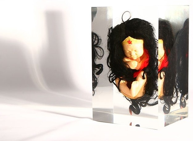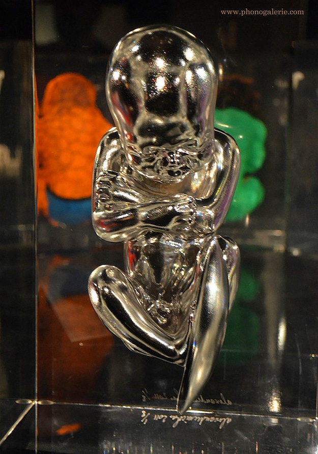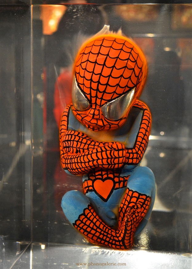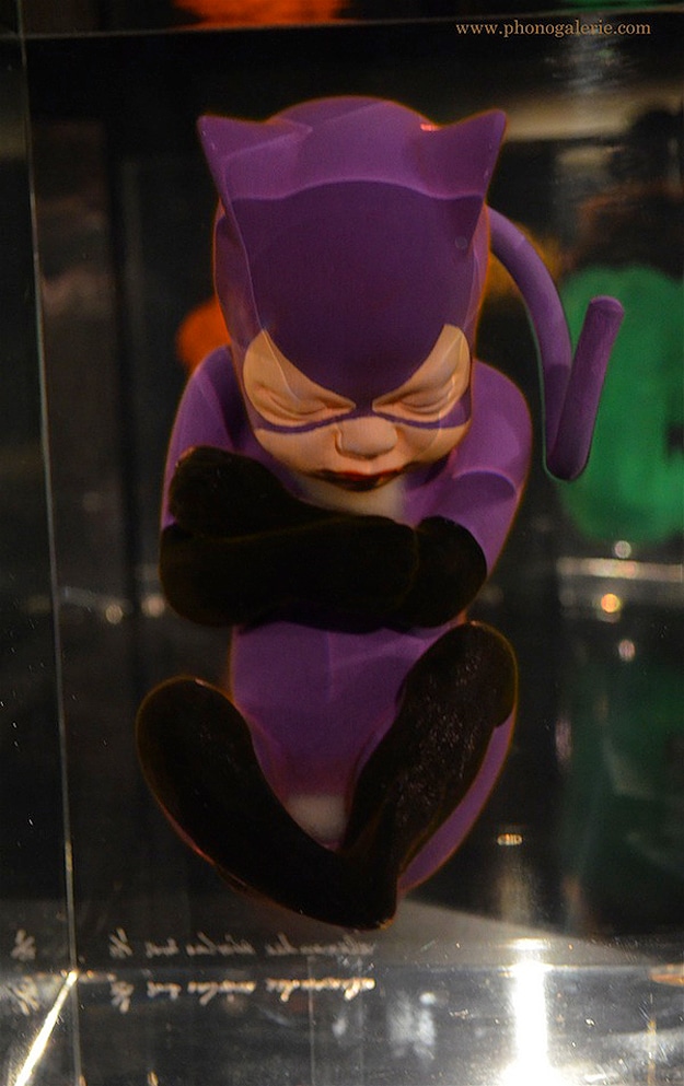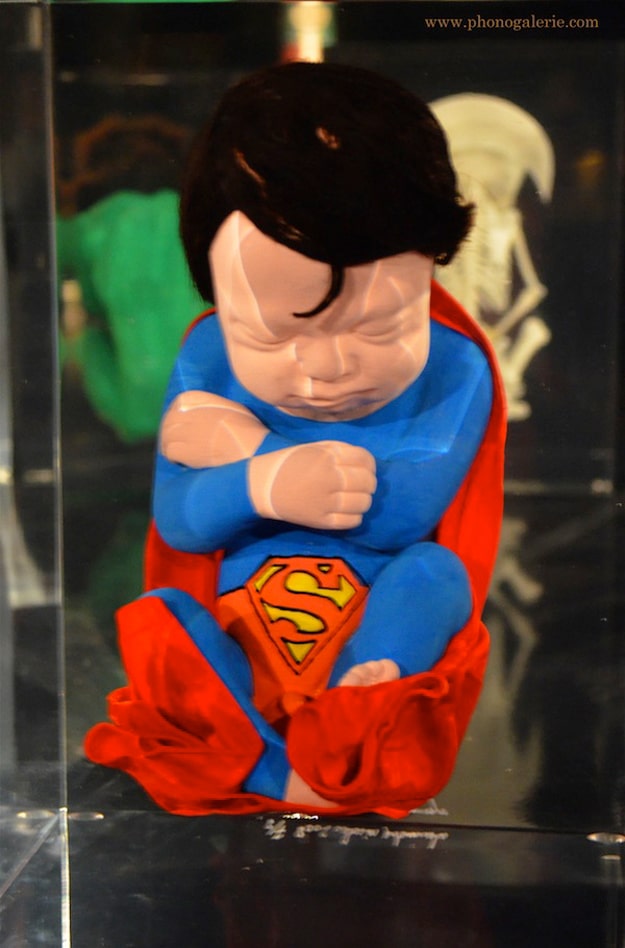 These are very interesting to me, especially since they almost look like they are in a fluid, which is to mimic embryonic fluid I suppose. They are actually inside blocks of synthetic crystal. So I suppose the legend is true, superheroes are born with their costumes and capes on after all. Alexandre calls this collection Superhero Fetuses, and they are being displayed at Halle Saint-Pierre museum in Paris right now.
