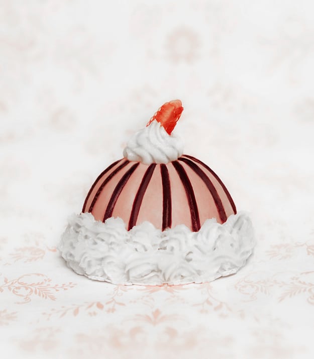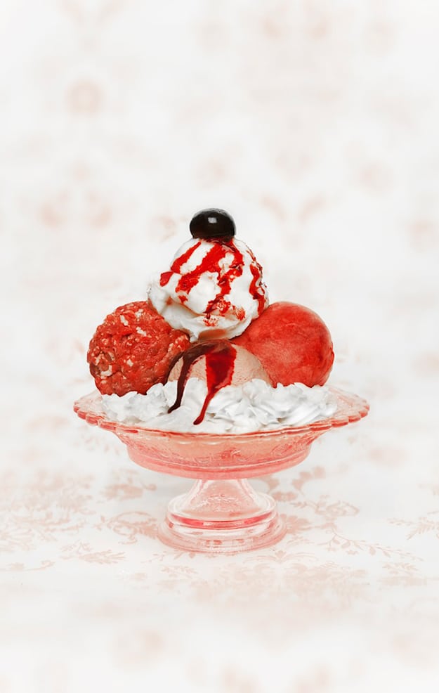 Jamine Schuller created these unusual designs, and her inspiration was an experience she had with her former vegan roommate who created a turkey out of Tofu. These desserts, part of a collection called Sweet Meat, are made from a raw pig’s heart, minced meat and animal fat. *gag* She used two liters of blood (looks like chocolate sauce), a bunch of grease and 5 kilos of raw meat. The cherry on top of the ice cream sundae is the pig’s heart.