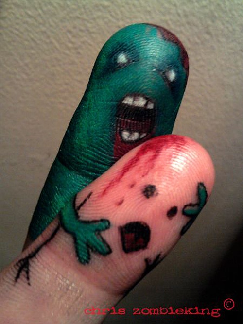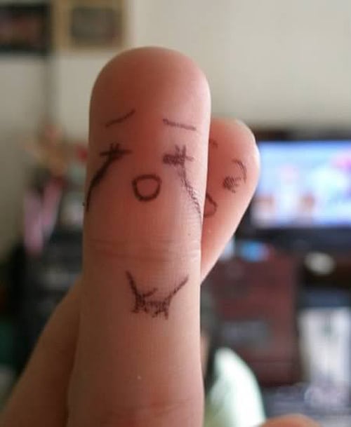 I don’t know what it is about drawing on our fingers and toes that is so much fun, but we’ve seen it before, and it can be surprisingly creative. It’s like a cross between body painting and traditional drawing. Sure, several of these pictures represent guns, hanging, blood and even puking, but somehow when that’s drawn on a finger, it’s cute and funny, not violent and offensive.