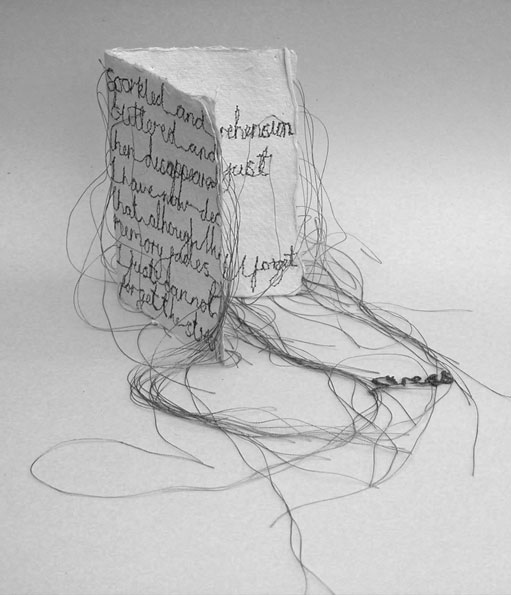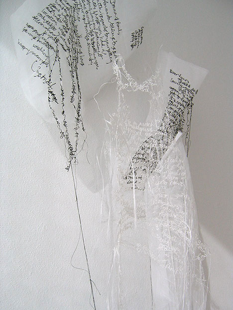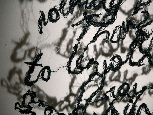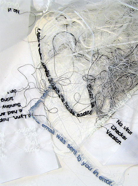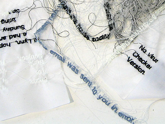 Textile designer Donna Rumble-Smith felt the same way and used that nostalgic feeling to fuel her inspiration to create an installation called “Signatures Exchanged for Passwords.” She embroidered handwriting that turns into more familiar, less emotional, less intimate text that we see in every email. According to http://mocoloco.com, “Not only have we traded our signatures for passwords, but all the personality and thought behind those epistles has been diluted into shared fonts and a send button that comes with more than its fair share of regret.”