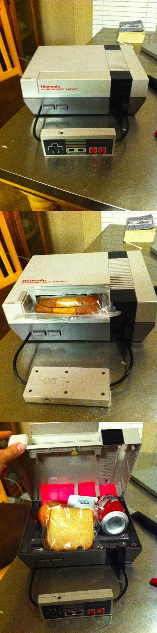I have so much to say about this. I don’t even know where to start. I absolutely love this NES mod, and I truly think it’s brilliant. This is better than a lunchbox available in any store in the whole world; I’m definitely convinced of that. However, when I think about taking my own NES and making something like this, well, I get a little tear in my eye. Yep, I guess I’m just now realizing how special that dag-gum thing is to me, and I could never destroy my baby for this purpose.
