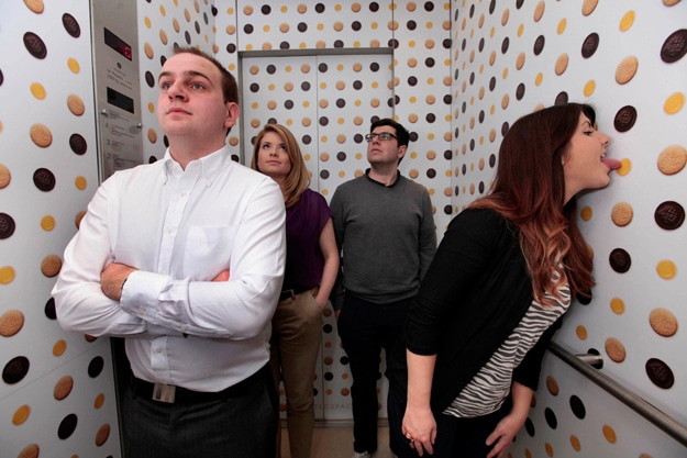 Obviously this isn’t the first lickable wallpaper ever made. Everyone knows that credit goes to Willy Wonka and his lickable fruit wallaper. But, this is definitely the first cookie flavored wallpaper, and the first lickable wallpaper ever installed in an elevator. Personally, I think it’s a brilliant idea. You know how boring those elevator rides can be. I’m sure watching everyone with their tongues slobbering all over the elevator walls would add some entertainment to the ride.