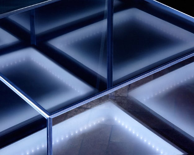 The designer, Ben Alun-Jones, made this Affinity Chair from acrylic, mirror film (like the tinting on car windows), LED lights, ultrasonic sensors and some custom electronics. When this chair sits alone in a room, it’s like a chameleon, and it blends into the environment to seem invisible.
