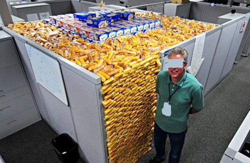 These are Twinkie hotdogs, and believe it or not, that’s not the bizarre part. The fact that someone stuffed Tootsie Rolls into a sliced open Twinkie (in the first image), and then covered them in colored frosting is strange, true (get the tutorial here on The Seven Year Cottage). However, the fact that some people put REAL hot dogs into sliced Twinkies (Weird Al style) is an abomination of all that we hold sacred. I mean, reeeeally? It’s so strange I almost want to try it. I could totally get down with that Twinkie wedding cake and that Twinkie cubicle too. Lucky dogs.