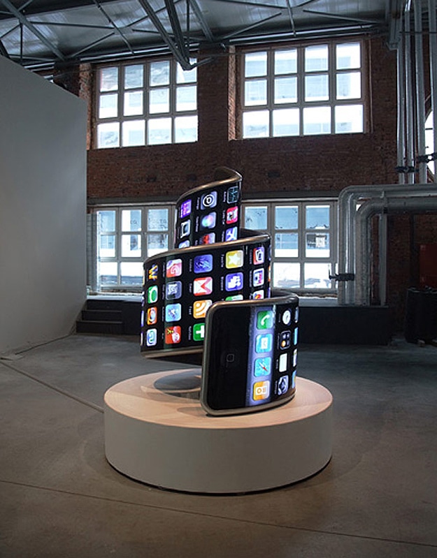 Russian artists Alexel Shulgin and Aristarkh Chernyshev (known as Electroboutique), created this twisted iPhone, which was inspired by Tatlin’s Tower, and twisted iPod as part of an exhibition on display now at the Science Museum in London.