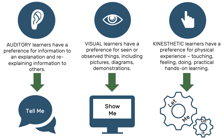 We often implement the ‘Tell me, Show me, Let me do it’ model to teach to each preference. Begin by explaining the task. Next, draw diagrams and demonstrate how to perform the task. Finally, allow learners to do the task for themselves.