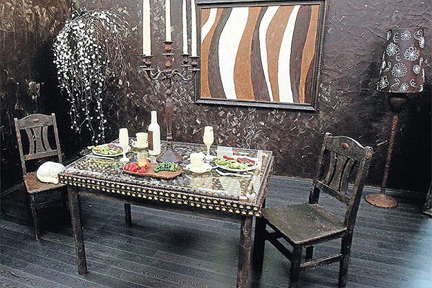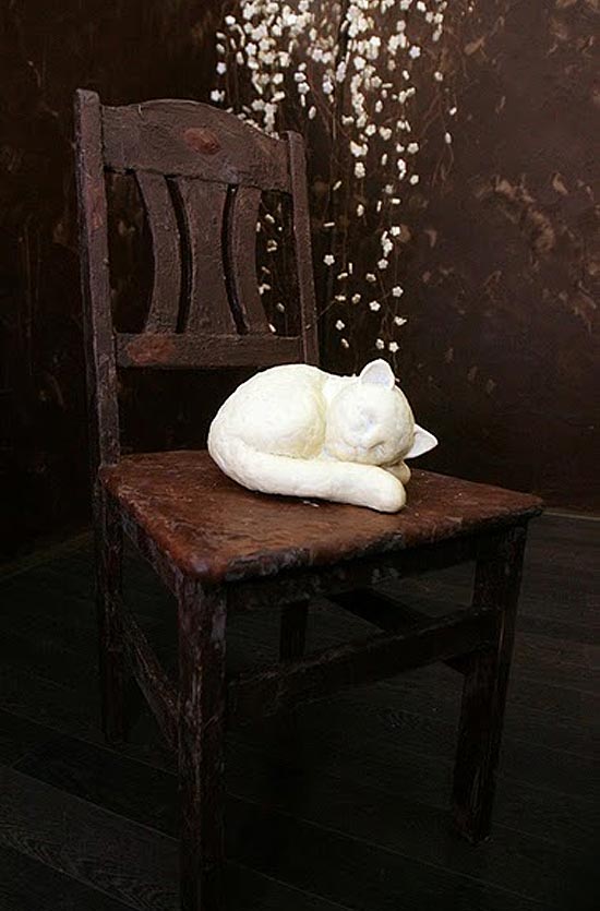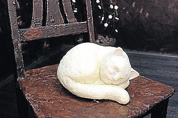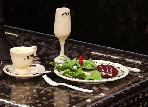 It is designed to look like a traditional sitting room, and everything is made of chocolate, and I mean… everything. This includes the chairs, the lettuce on the plates (green chocolate), the cat sitting on the chair, the champagne glasses, the forks, the pictures on the wall and even the ceiling. All of it is chocolate.