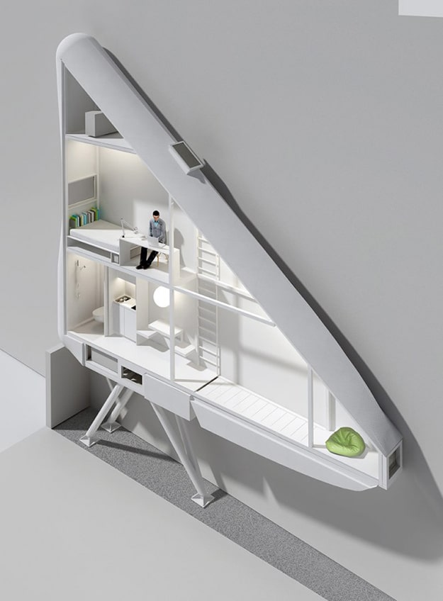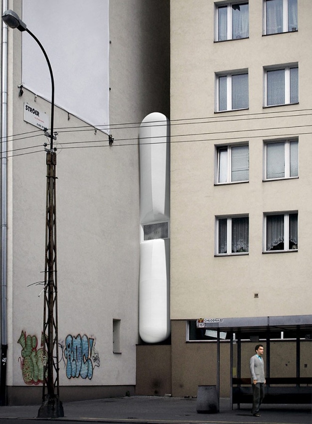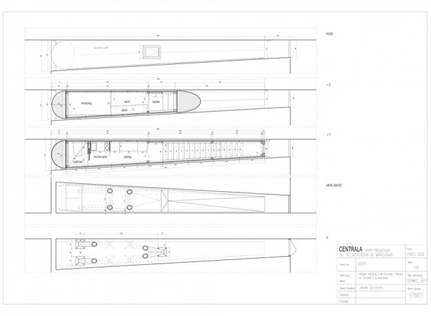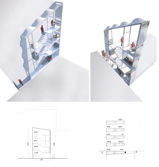 When I describe this to you, keep in mind this whole house is only 52 inches wide (1.32 meters) inside at the widest place (it’s 40 feet long). It has one bedroom, one bathroom, a sitting area and a kitchen on both floors. In the original design, the space was deeper and sported stairs, which you can see in the pictures below. However, later the designer decided it would not have stairs, but a ladder instead. When asked where he got his inspiration to build this house, Jakub Szczesny replied, “I saw the gap and just thought it needed filling. It will be used by artists.” There is not much room for any furniture or personal belongings, so the tenants will have to be content enjoying a simple lifestyle.