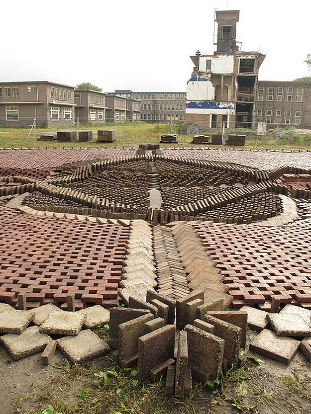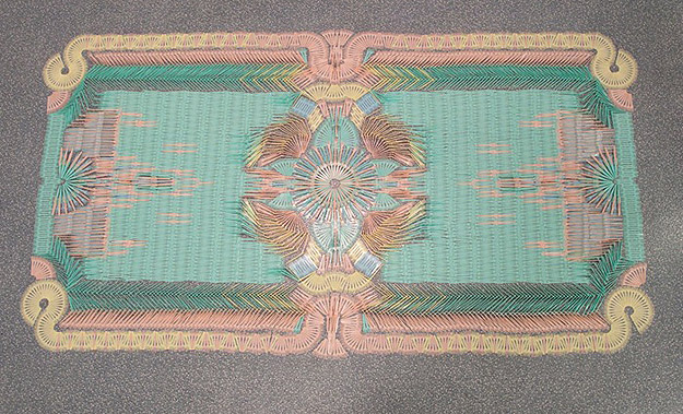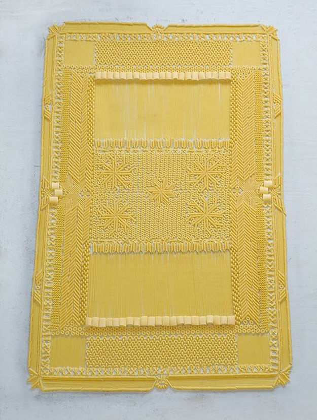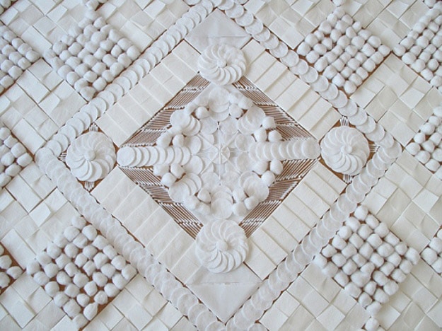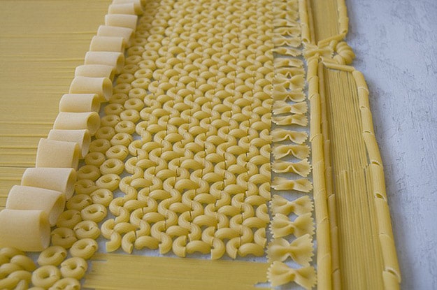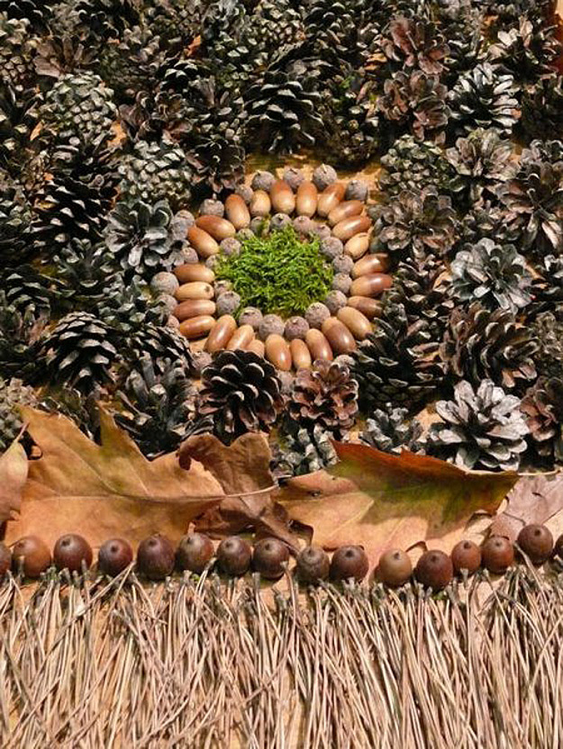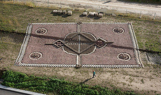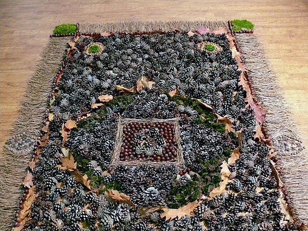 They have fun creating these without making a sketch or a plan before getting started. Instead, they let the shape of the material determine the symmetry, and they place each piece one by one until the carpet is completed. Of course, each one is temporary, which is kind of sad to me since they are so fabulous and time consuming. As you will see below, these carpets are made from pasta, army men, plastic forks, cups of coffee, band-aids, forest stuff (like seeds and pine cones), cotton cleaning supplies (like swabs and pads) and bricks. You can check out their website for more designs. Fascinating!