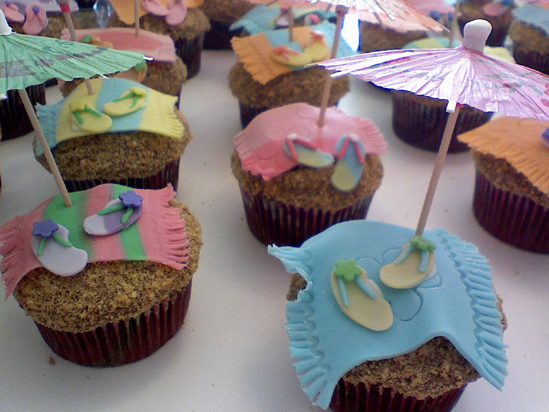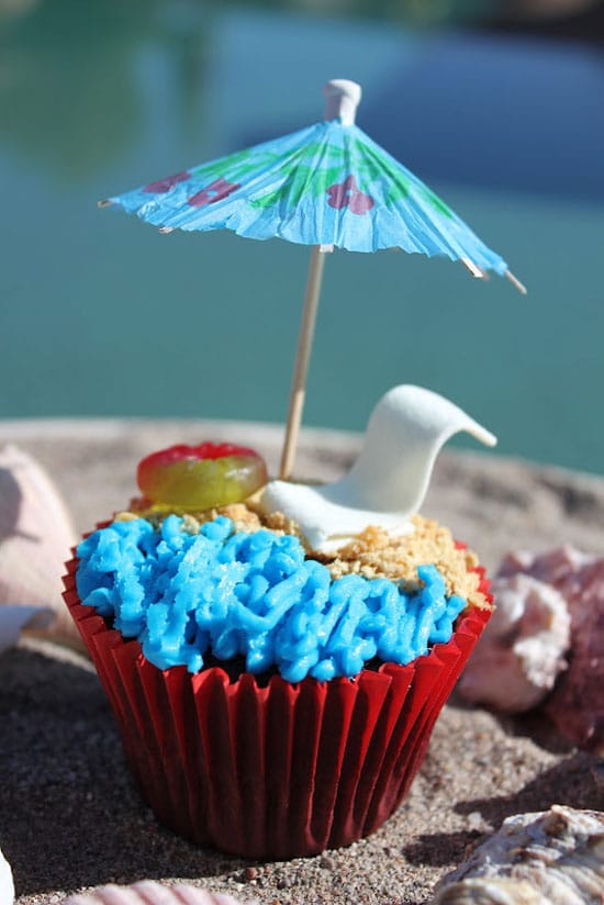 Today I was trying to think about how to bring that beachy-oceany feeling closer to home, and I think I’ve found it. And, of course, it involves a cupcake. These are the cutest little beach cupcakes I’ve ever seen. They have everything you need for your beach vacation right there on top of the cupcake.