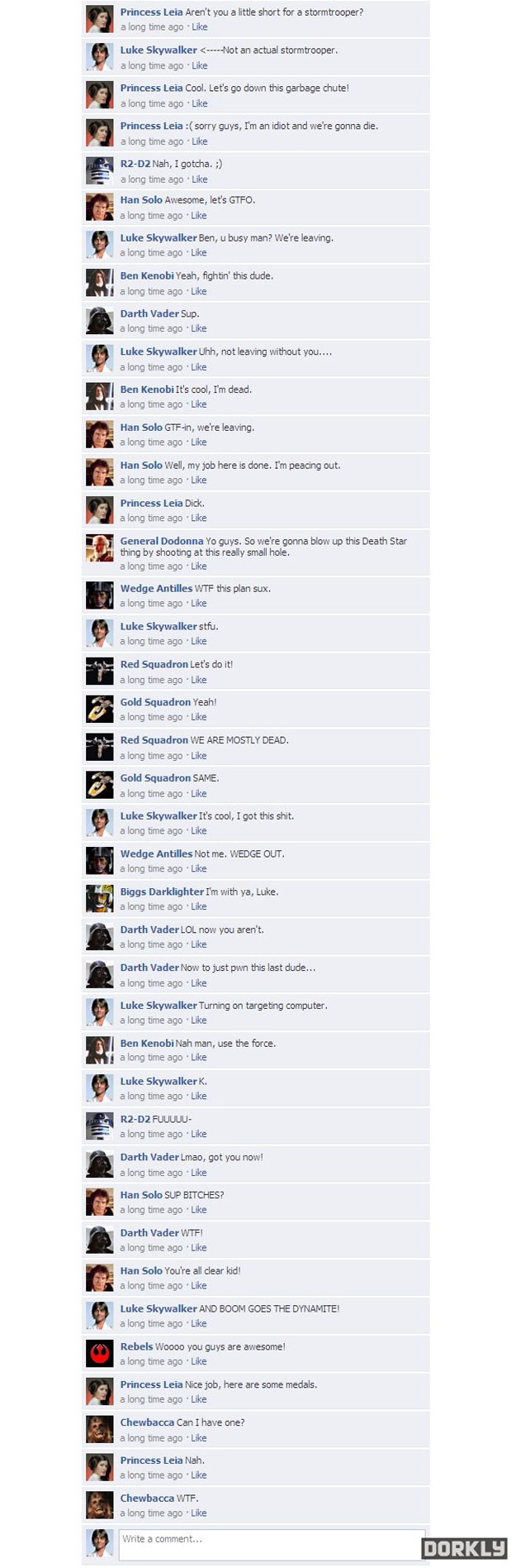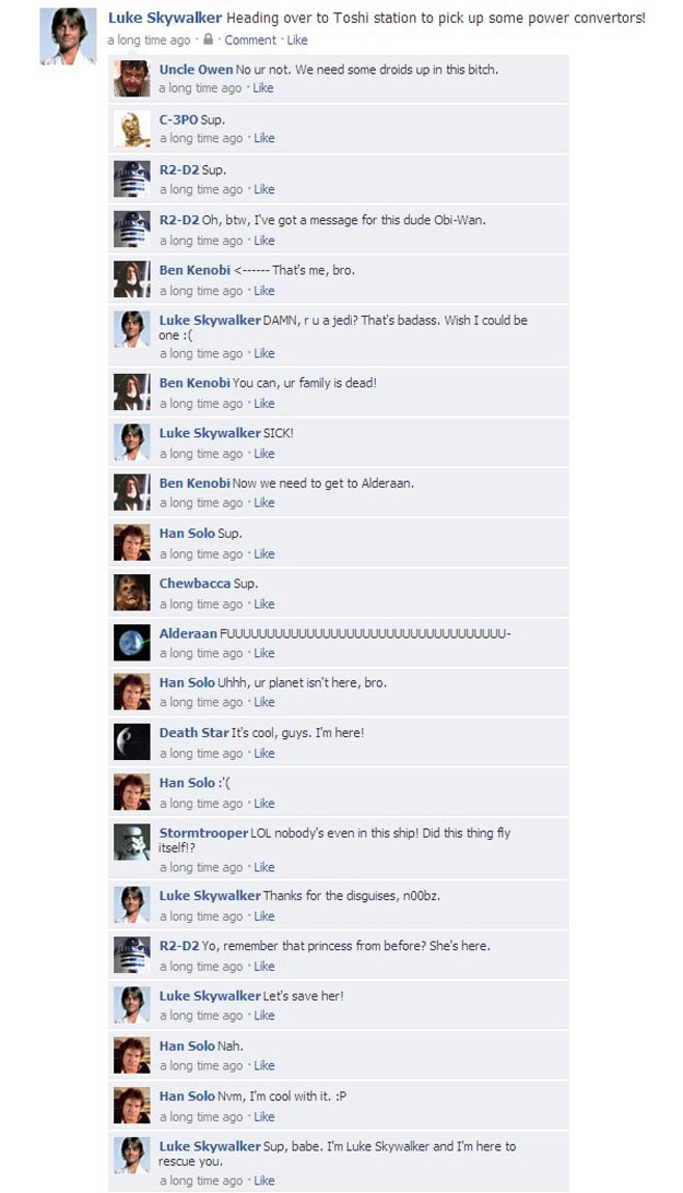 I think I have every line of A New Hope memorized. It’s a classic in a category of it’s own. Whether you like Star Wars or not, you just can’t mess with something that legendary. However, have you ever wondered what it would be like if that same story was released today? What if the characters used the same language that we use in social media? It’s kind of strange to think about. It’s like mixing oil and water. It just doesn’t seem right. I wish I knew who wrote this Facebook thread because they definitely deserve some props. This is the entire New Hope Star Wars movie as told on Facebook.