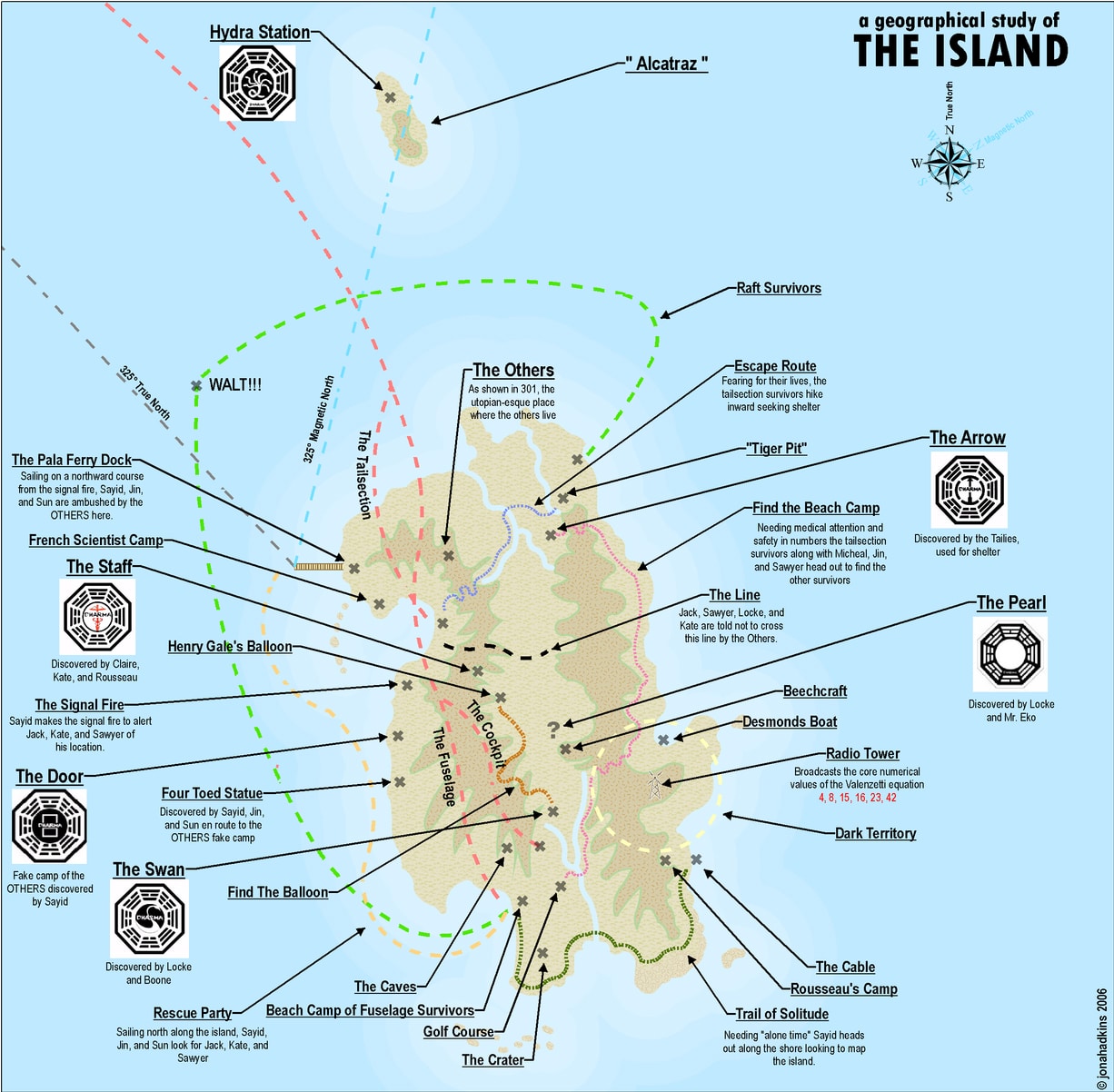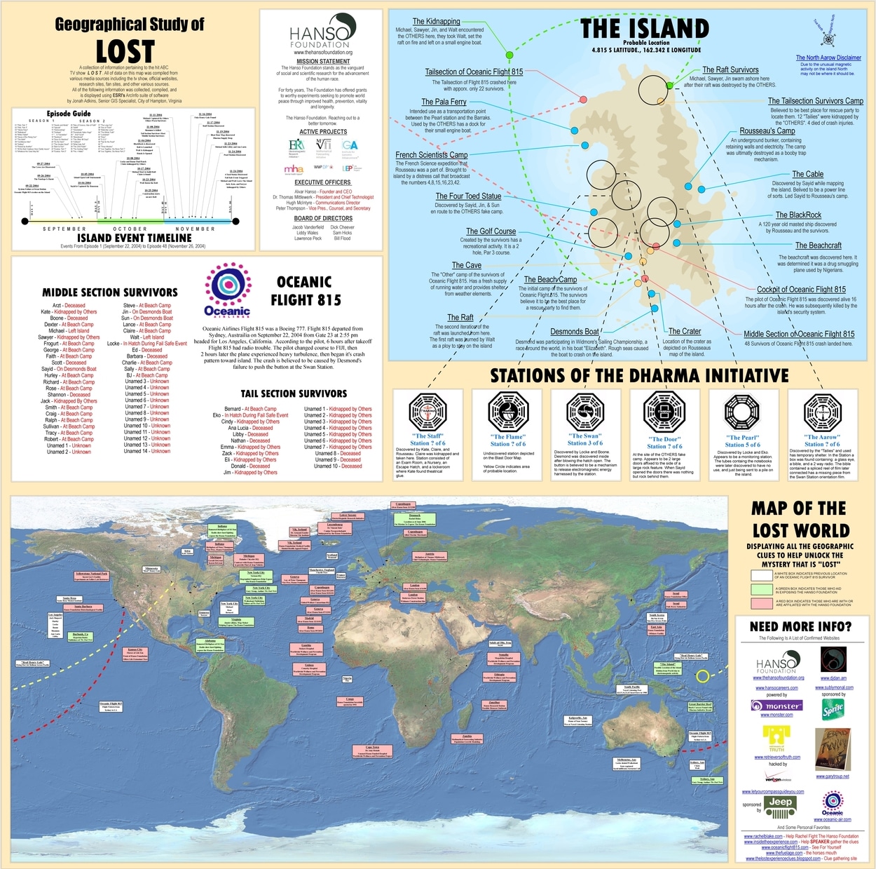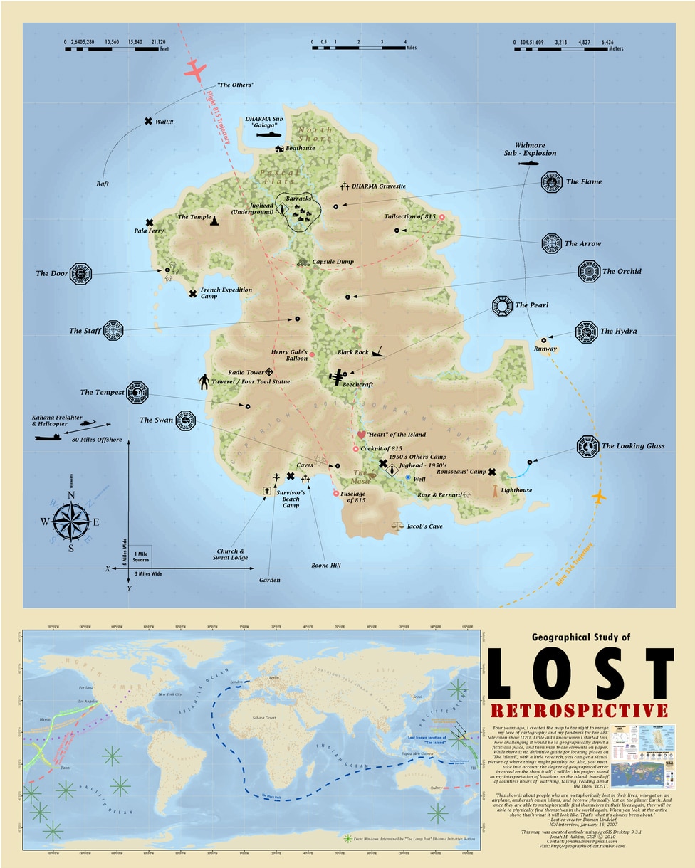 However, I couldn’t pass up this awesome design idea done by talented cartographer Jonah M. Adkins. The detail is just amazing, and it helps me understand the concept of LOST with just a few glimpses. All the events become crystal clear, and I feel like I could jump in and watch LOST at any time and still know where things and events are located without even having watched one full episode.