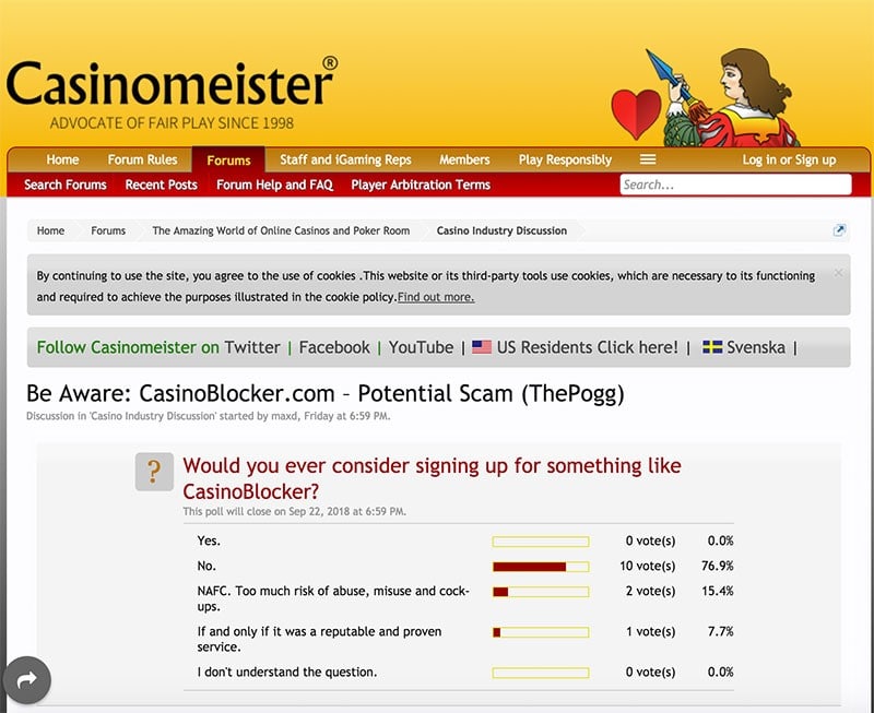 A discussion on casinomeister.com shows how players themselves are skeptical of this site and don’t seem to trust it. An initial poll at casinomeister has their members voting their opinion they think casino blocker is scam.