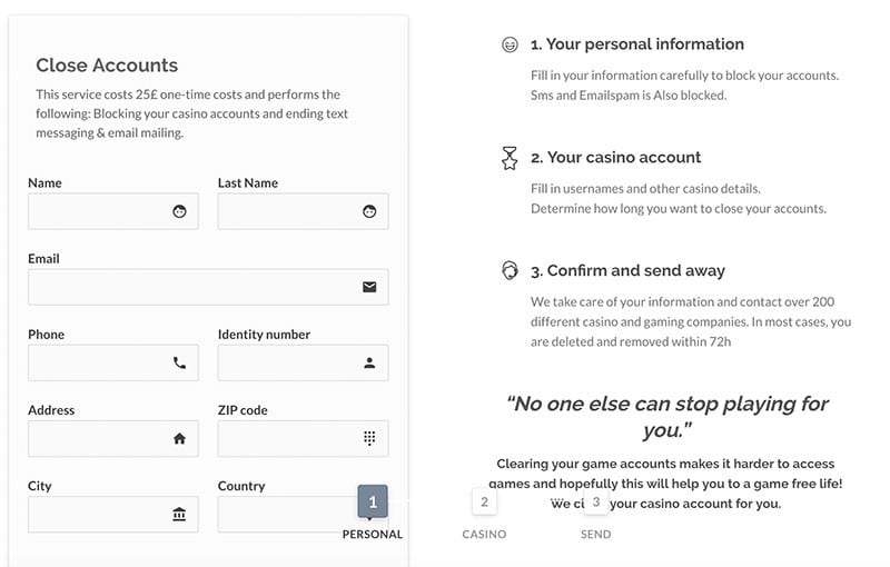 CasinoBlocker.com has a simple step-by-step process which allows users to achieve this objective. The process starts when the player shares their personal information with the site including name and surname, phone number, email, and address. Next, you’ll have to provide information about your casino accounts and choose the number of months you want to stop your accounts, but you can also choose to delete them permanently. And that’s it (according to the site). Of course, you will have to pay for their service too. The cost is $25 which sounds more than reasonable.