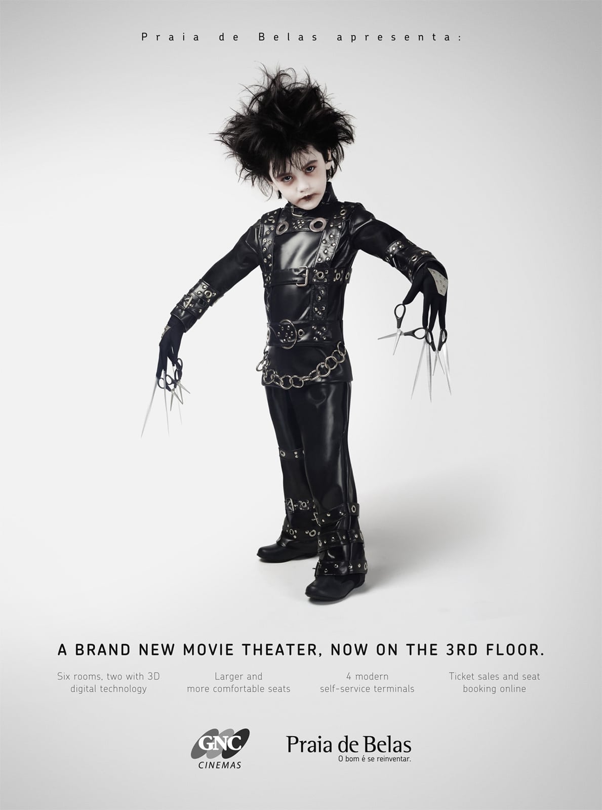 These ads started displaying a few months ago, and I wonder if the theater has been successful as a result. According to Ads of the World, it’s “a brand new movie theater, now on the 3rd floor with six rooms, two with 3D technology, larger and more comfortable seats, four modern self-service terminals, tickets sales and seat booking online.” Dang, I want to see a movie there! Each one of these kids looks strikingly like the movie character he or she represents. I would love to know more about the casting process for this campaign, and how they decided on which characters and which kids to select. The Edward Scissorhands is my favorite. Everyone involved in this project did such a great job! What a great way to make watching movies seem like a new experience. It’s this type of creative advertising that can inspire you to achieve greatness!
