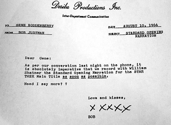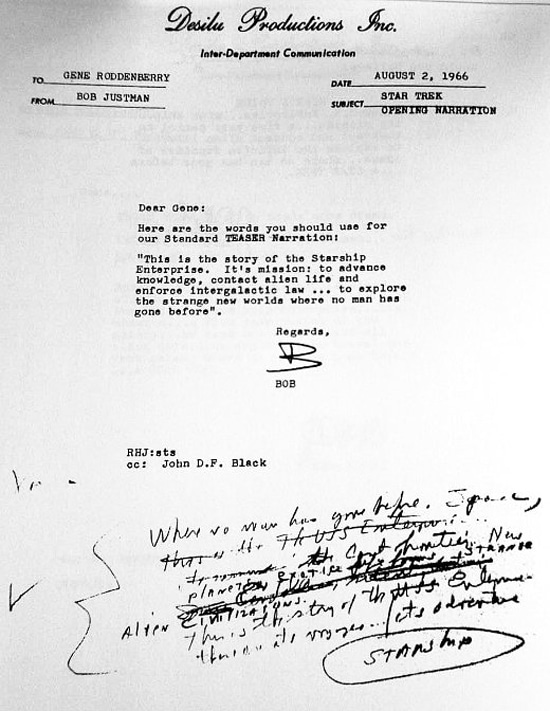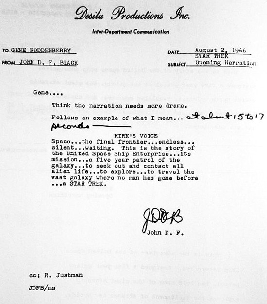 You can see the typed memos below from 1966 (I guess that was equivalent to email back then) that were exchanged between Star Trek producers Bob Justman and John Black. It took about a week for them to write the monologue. Then, about an hour before it was recorded by William Shatner, Gene Rodenberry, Star Trek’s creator, put his finishing touches on it.