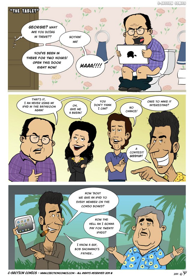 All you really need to do in order for a scene to be rewritten is throw an iPad or a smartphone into the mix and you have yourself some seriously interesting interaction. The way the C-Section Comics guys have approached this is brilliant, and think I would have actually liked the new Seinfeld if there ever was some new shows recorded. I might have even liked it more than the original series. You never know, maybe they will have a change of heart and go for a few more shows in the future. God knows the fans would love it!