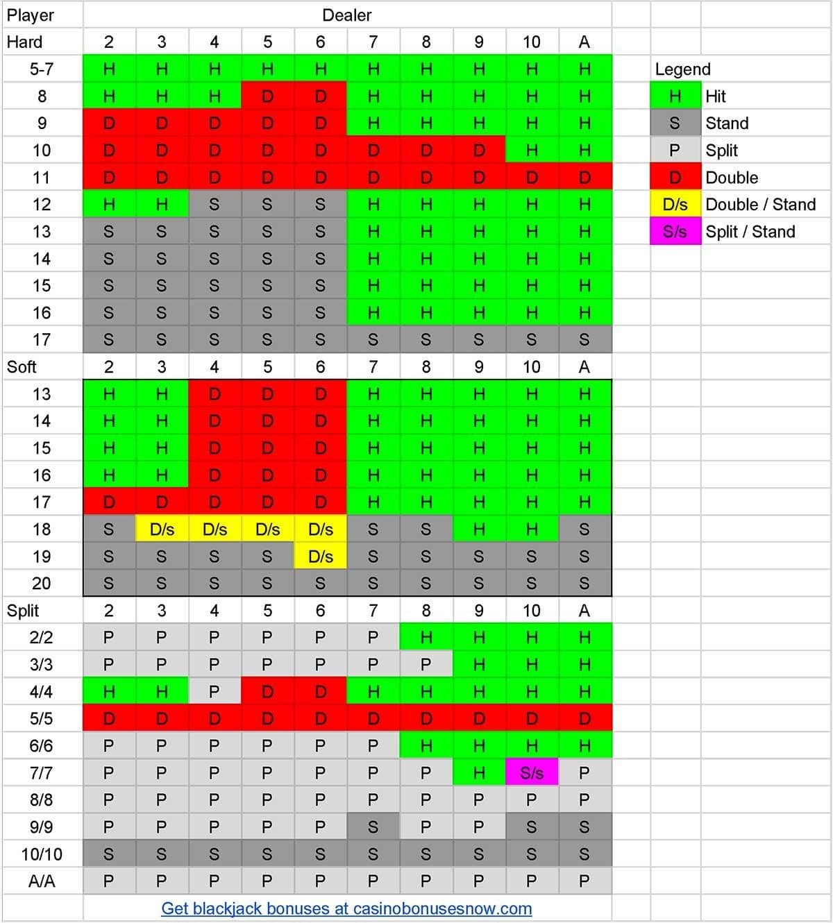 It only takes a few hours of practice to master basic strategy for blackjack. Really you just need the right blackjack strategy chart to match the specific game you are playing and the chart is easy to follow. The chart is fairly simple to follow and you can start practicing blackjack right away. Your cards are on the left side of the chart while the dealer’s cards are at the top.