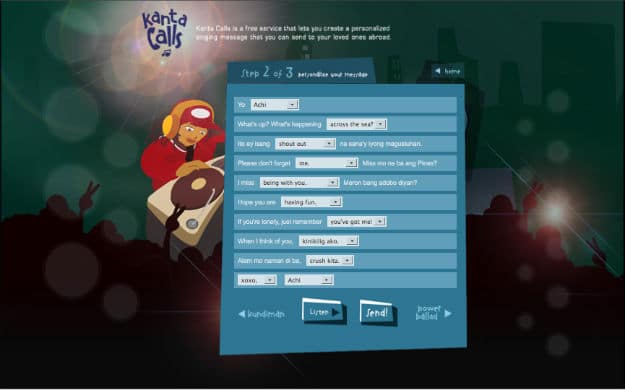 The application is housed on the site Kanta Calls (Songs via Mobile). The aim of the site is to allow users to go to the site and follow 3 simple steps. Step 1 is to choose a genre (rap, power ballads or Kundiman). Kundiman means “romantic” in Tagalog (a Philippine dialect). Step 2 is to personalize and create your song by choosing from the available words provided on the site. You can even listen to some of the sample songs before selecting the words for your song. Then after you are finished with the words, your proceed to step 3 which is to fill out a form. The fields include one for the mobile number of the person you want to send it to. After you complete the 3 steps, the person you want to send it to will receive your personalized song via their mobile phone. What is great is that all of this is offered for free.