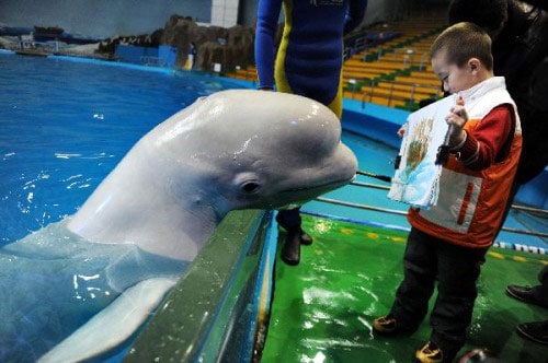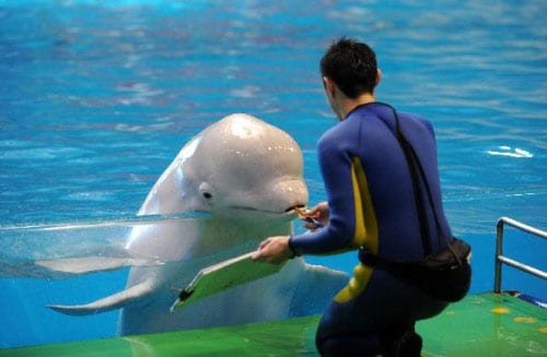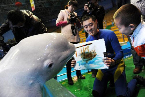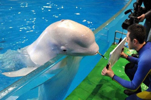 This first animal is a dolphin named Xiaoqiang who lives in China. Just last month he demonstrated his artistic talent. As you will see in the pictures below, first a young boy showed him a painting. Then, the trainer handed Xiaoqiang a paintbrush and held a canvas for him while he began to paint a beautiful picture of another dolphin.
