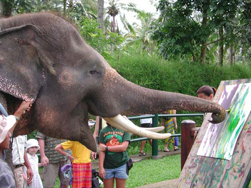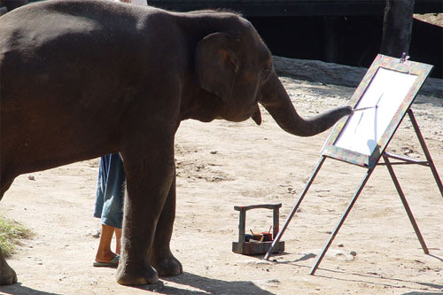 The second group of animal artists featured today are elephants from Thailand. Apparently elephants are inherently interested in painting because sometimes they will pick up a stick and draw in the dirt. The elephants at the National Elephant Institute were taught how to do the same thing, but with a paintbrush and paint. You can view an entire gallery of this elephant artwork here.