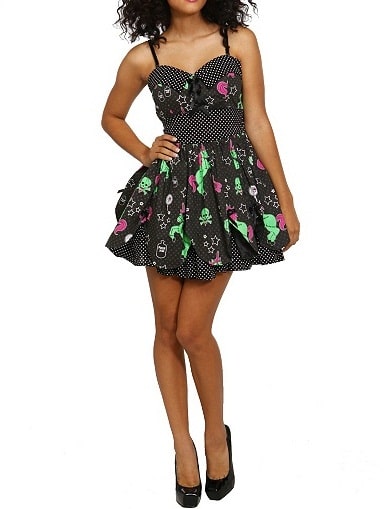 There is nothing classier than going retro, and this Hell Bunny Zombie Unicorn Petal Dress takes you back in time with an updated twist. It is covered in colorful zombie unicorns, skulls and stars to transform your wardrobe so you can display you inner geek goddess outwardly.