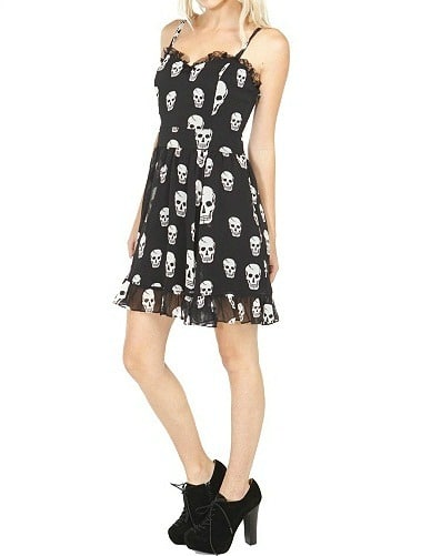 Skulls are hip, they seem to be a continuing trend from year to year, and it doesn’t look like this trend is likely to change for 2013 either. You will look dangerously flirty in this chiffon spaghetti strap black dress covered in skulls.