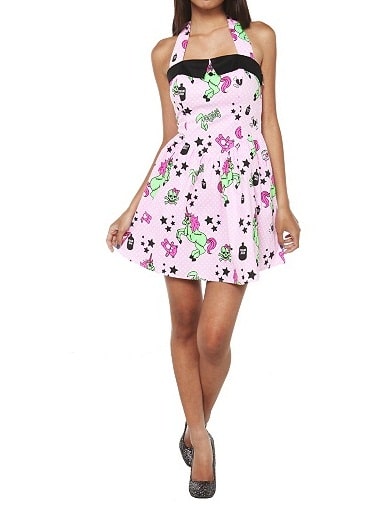 Pop with pink in this classic retro-styled dress that ties around the neck, and did we mention it has zombie unicorns too? Make a statement while still looking classy.
