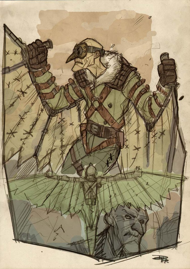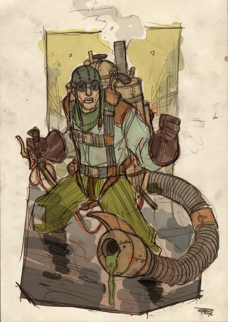 Spider-Man is designed with a web-shooter belt device, and his youth is wonderfully captured. The Venom symbiote skins Eddie Brock like a dandy, and just look at that awesome vest and top hat. Green Goblin has the prolific steampunk goggles in his design, and it makes sense, what with the whole gliding around the city causing havoc theme going on. Just look at Doctor Octopus’s doo-hickey doo-dad contraption that controls his steam-powered limbs, or Scorpion’s back canister of acidic chemicals with its thematically perfect tail-hose, which is both so diabolically cool… and dangerous. Vulture, done in this style, just can’t go wrong, but if his wings are anything like the earliest attempts at getting off the ground, then Vulture’s in trouble! Finally, there’s Rhino with his welded iron armour shell, and I’ll be honest, this is the only Rhino design that doesn’t make me roll my eyes at the character’s conceptual absurdity.
