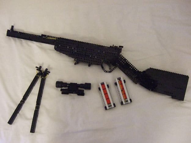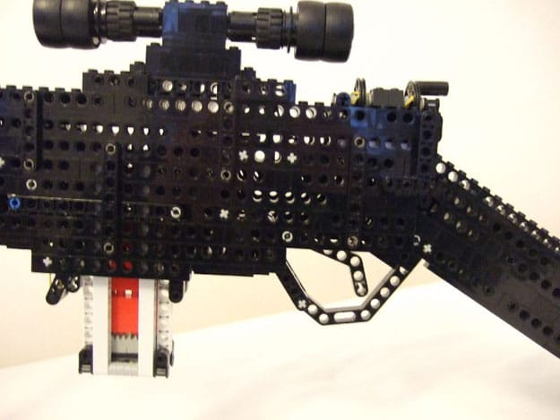According to his website, “It is a working magazine-fed rifle in bolt action configuration, with detachable magazines, sniper scope and bi-pod.” In other words, as you will see when you watch the video below, it can point at the target, then accurately shoot the Lego blocks that are set up on the floor.