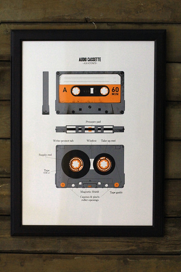 This vintage screen print poster depicting the anatomy of an audio cassette was created by Belgium artist Ramzi Mesaddek. It’s available for sale in his DefenseDAfficher Etsy Store for about $40. Go ahead kids, click on the image below and look at it closely. You will most likely marvel over our prehistoric ways, but for those of us who know better, this will bring back a lot of fun memories.