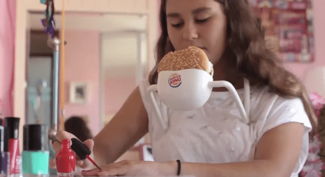 I have to agree though, even though the concept itself borders on the insane, and definitely on the edge of the weird, it still makes up for it with its quite genius design. I mean, how many times have you wished that you could both eat your burger and do your work at the same time, right? This burger holder will definitely linger on in people’s minds, and maybe that’s why Burger King decided to use it in their commercial. After all, who wouldn’t want to be able to dance, drive, play games, tattoo and all those other things while you’re eating your Whopper?