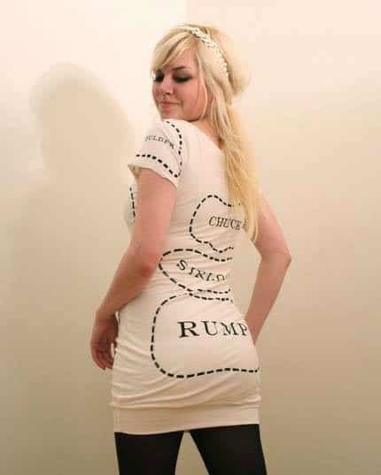 I am very much a woman and very much a meat eater, so I love the title of this article. Now you can sport your rack and your rump in this completely adorable meat dress, or anatomy lesson, however you want to look at it. This creative creation was designed by Kelly a.k.a. ‘Your Present’ on etsy.