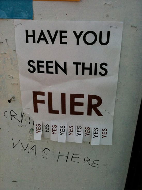 Josh Millard took that concept and added a flavor of funniness, which is making a lot of people smile. As you see, there is no purpose to these fliers he made. The message on some of them doesn’t even really mean anything. They are only displayed to give people a giggle, and I think anything that brings a little extra sunshine into the world is brilliant.