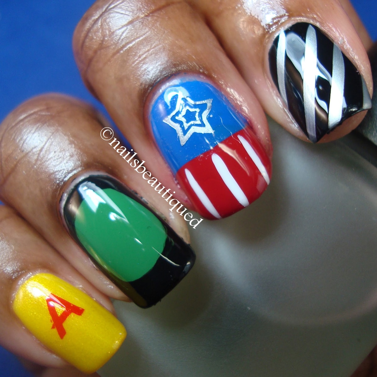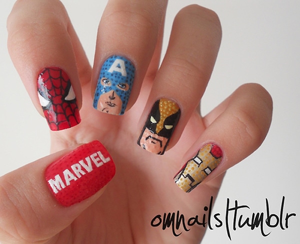 I’m blown away by the detail that these talented manicurists can polish onto their nails. What blows my mind even more is that many of them do this on their own nails, which basically means they can accurately polish with one hand. I have no idea how they do it. It reminds me a little of the artist who creates entire movie scenes on her own eyelids. I’m in awe of this kind of artistry. If you would like to view the entire collection of Avengers inspired nail art on the original article by Jill, just click over to Manicures to Marvel. Also, please check out these artists by clicking on their links in the image credits below. They oooooze talent!