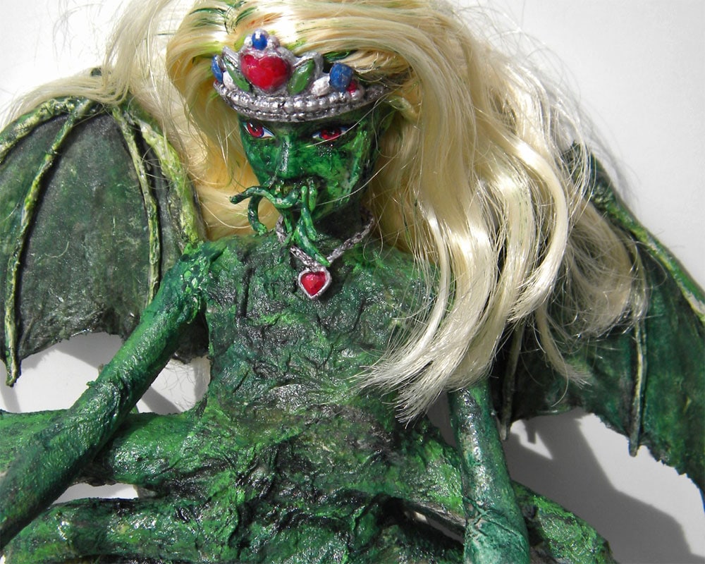 Made from an original Barbie doll, Sabrina painstakingly details exactly how she turned the perky plaything into an ancient soul-sucking creature. With a mix of latex, wires, tape, Kleenex and paint, this introverted wife proudly birthed one of the most grotesque and horrifying Barbies ever created. Her other Photoshop Barbies are pretty impressive as well, including Mage Barbie, Paladin Barbie, and a line of Mystery Science Theatre 3000 Barbies.