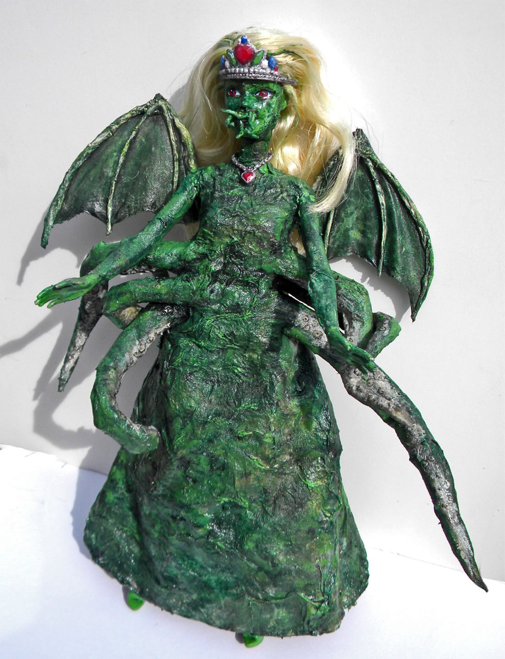 Now don’t go racing to your local Toys “R” Us store just yet. Cthuhlu Barbie is just one doll. Who knows, perhaps Mattel will get wind of this and mass-produce an actual Cthulhu Barbie doll. I can only imagine poor little Amanda’s face when she opens up her birthday present, sees it’s a Barbie, and then shreaks in horror when her new precious blonde princess is sporting tentacles and leathery wings. Yeah, childhood would never be the same.