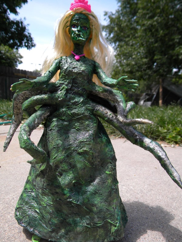 Then along comes Sabrina Zbasnik, the creative blogger behind Introverted Wife. What started as a simple fun Photoshop project to see how many crazy Barbie ideas she could whip up has turned into a nightmare. Well, a good nightmare. It’s the kind where you’re a big fan of sci-fi and horror stories penned by the likes of H.P. Lovecraft. Yes, Sabrina has created an actual Cthulhu Barbie doll.