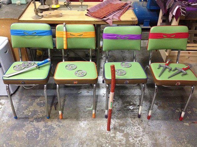 I suppose if you have four matching retro chairs somewhere in your attic or basement, and if you know a thing or two about reupholstering, you could make some of these for yourself. I have a feeling turning four chairs into four teenage mutant ninja turtles may be harder than it looks though.