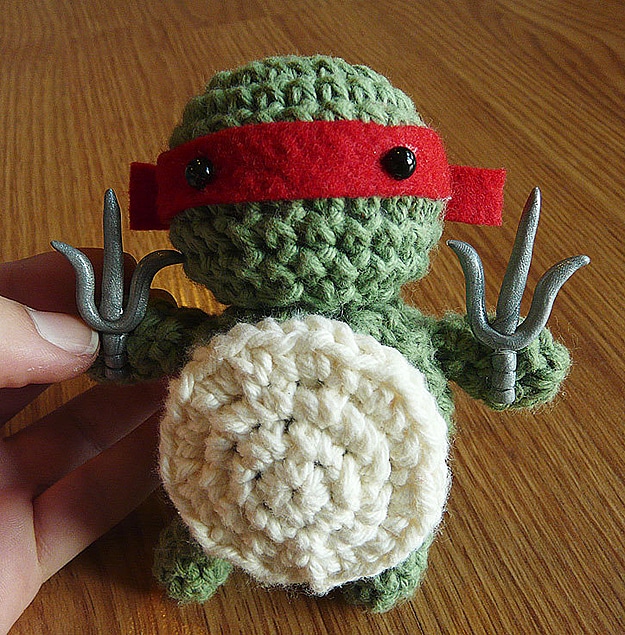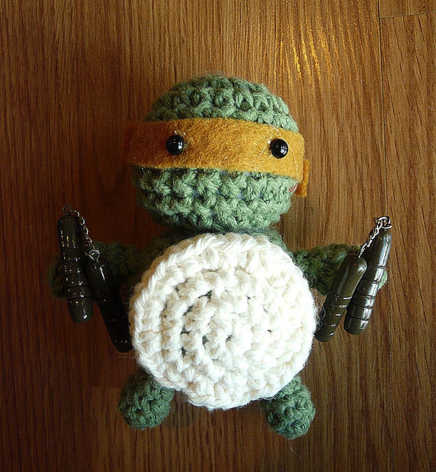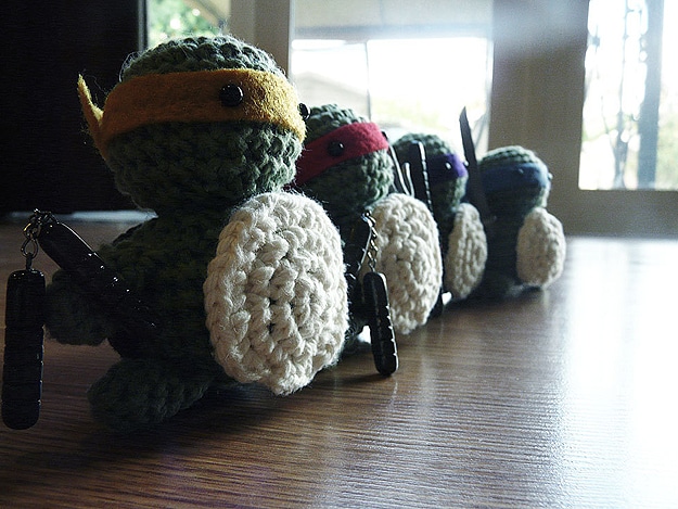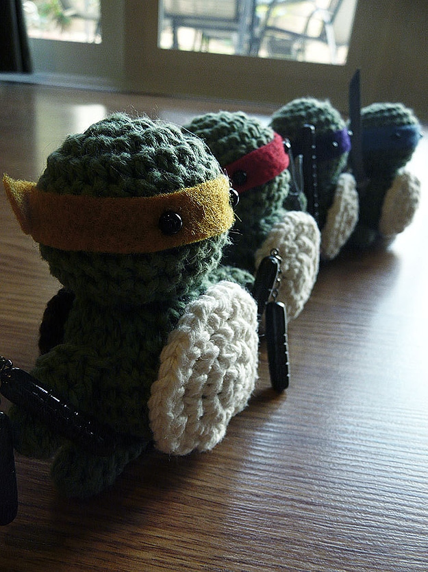 The latest in this long line of cute squishy designs is this set of four Teenage Mutant Ninja Turtles. Andrea Wuethrich, who is a full-time student living in Los Angeles, makes these and sells them in her Etsy store. Since each one is handmade, they are all a tiny bit different. She crochets the turtles, and makes the weapons out of polymer clay. If you would like to purchase a set from Andrea, just click over to her Etsy store. Andrea, these are soooo cute!