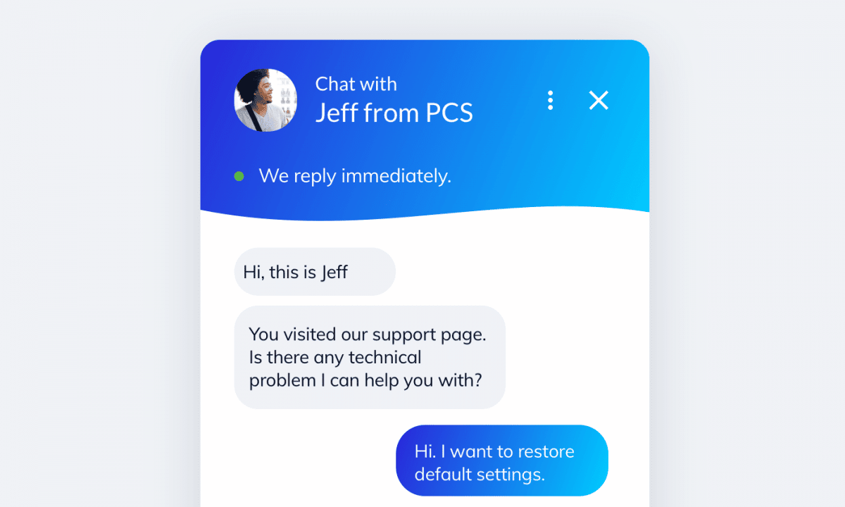 As you can see, this chatbot on a support page offers to help right away. The customer might have been searching a database of topics for the answer to their problem when Jeff offers to help. At this point, the customer has the choice to continue on their own or engage with the chat to get the help they need. This is a great example of a customer experience that gives the customer the option of engaging in the manner they prefer.