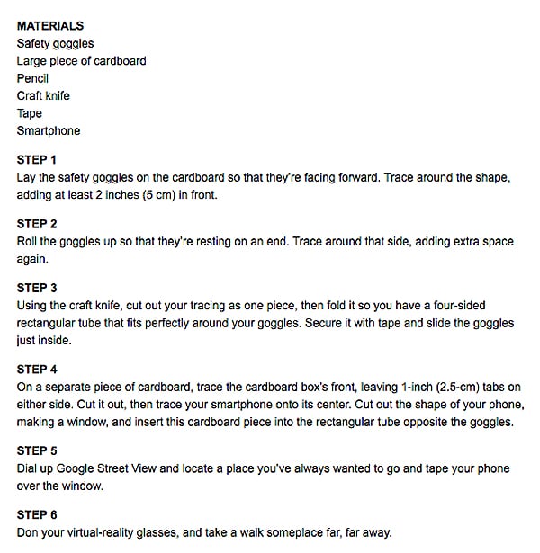 This was originally posted on POPSCI yesterday, and they took it from a book called The Big Book Of Hacks. All you need to make these virtual reality glasses are some safety goggles, a piece of cardboard, a pencil, a knife, some tape and your smartphone. Once you make these, you’ll be able to go anywhere Google Street View goes.