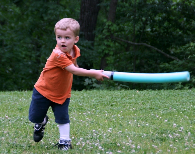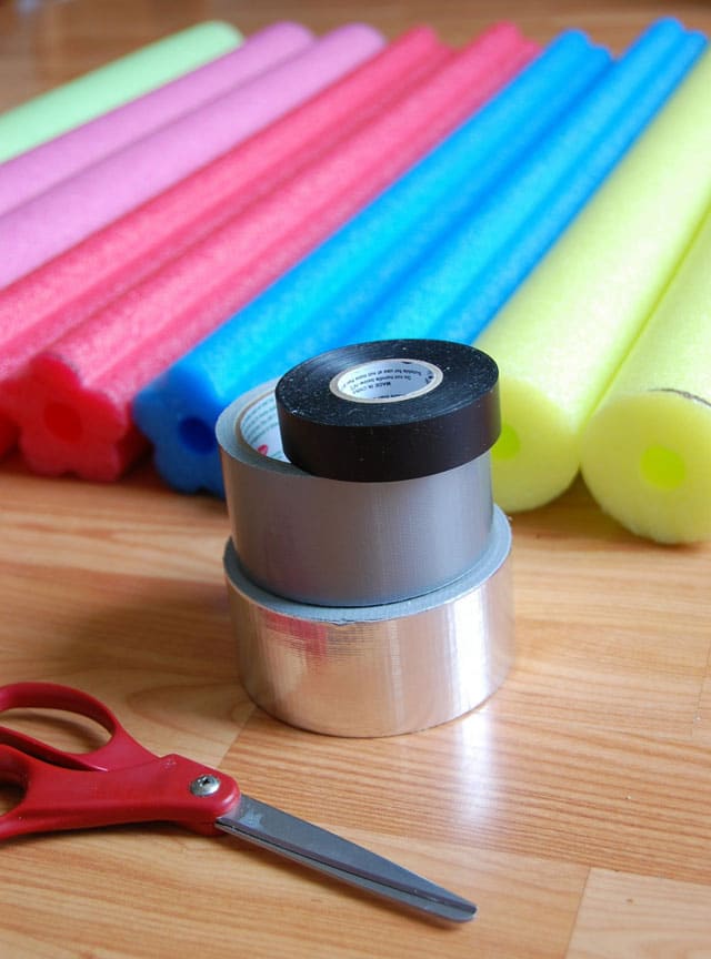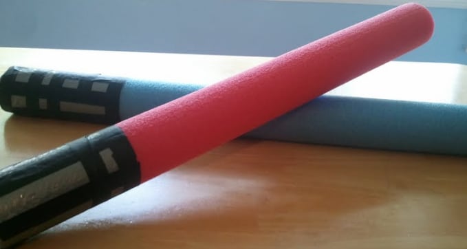 These are truly brilliant in so many ways. All you need to make them are some pool noodles (one for each lightsaber), a pair of scissors, some duct tape and some black electrical tape (or a black sharpie).