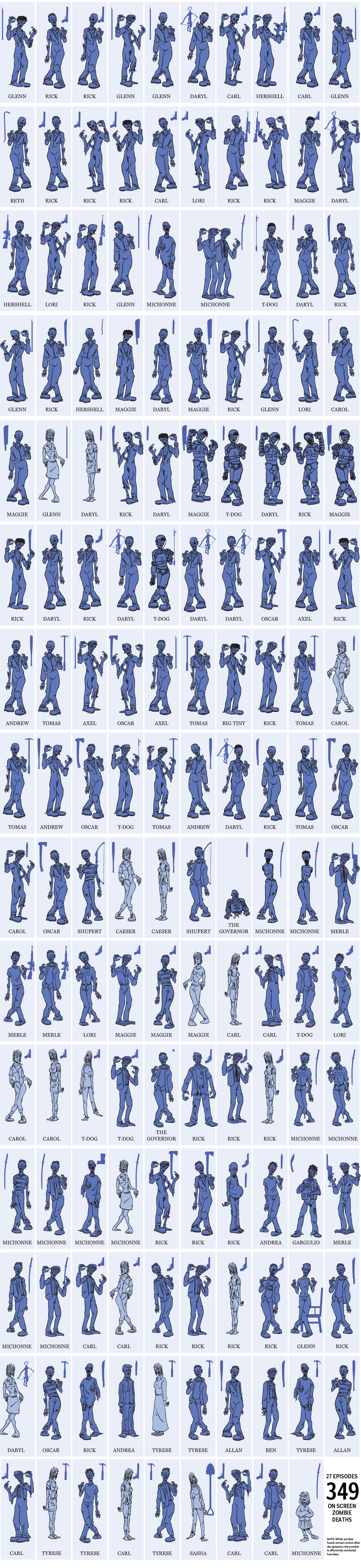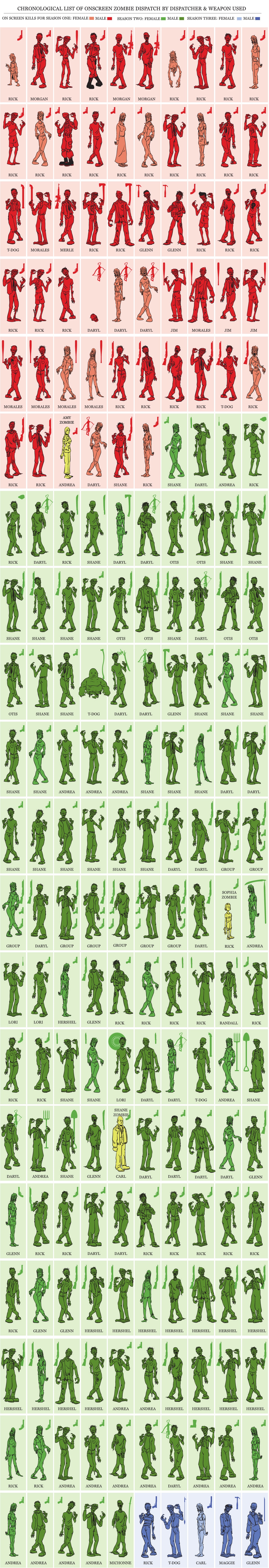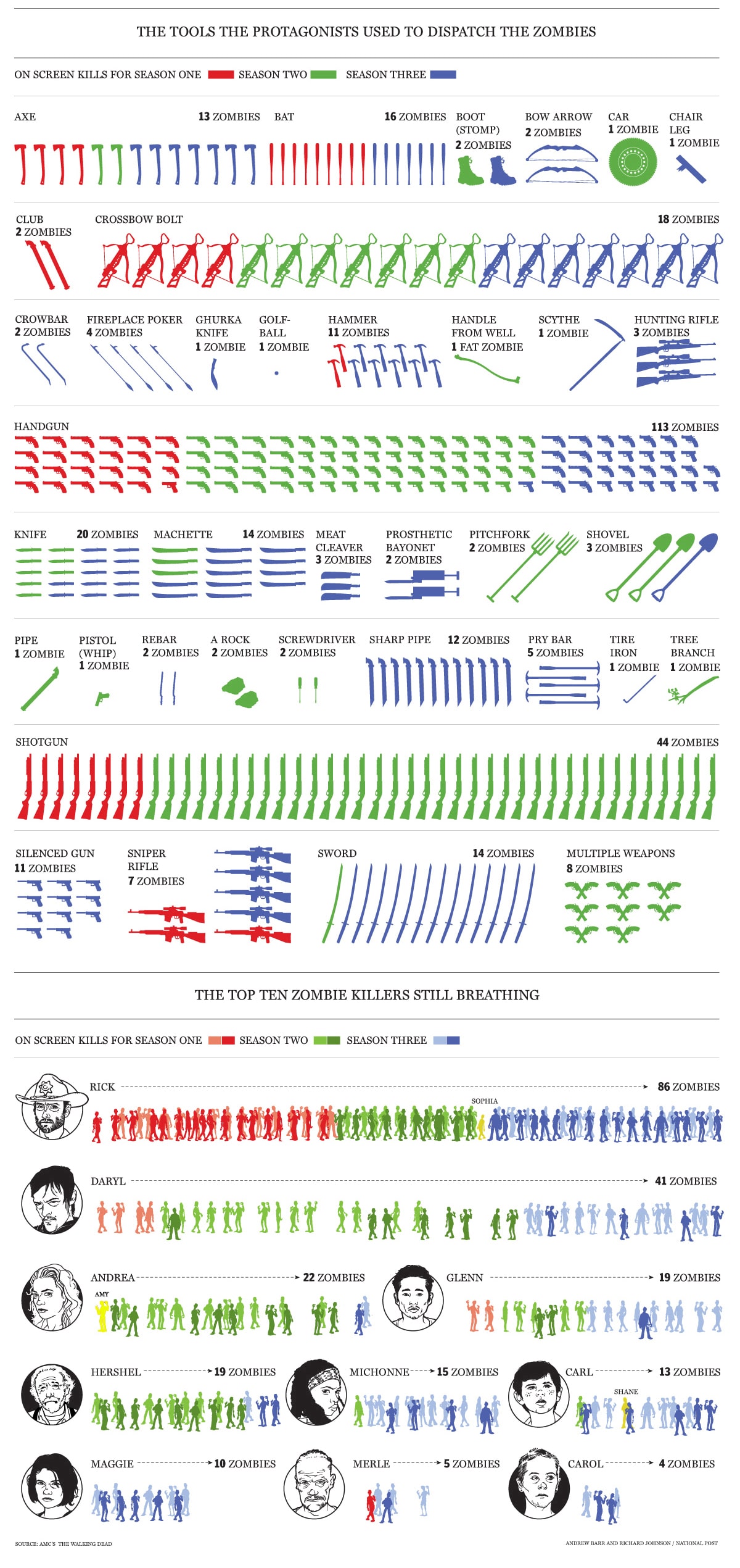 This very impressive piece of pop culture called The Stopped Dead was created by Andrew Barr and Richard Johnson and the original is displayed on National Post in an article called Stopping the Dead – a statistical look back at the Walking Dead series so far. It’s color coded for season one, season two, season three and main characters that have become zombiefied. Those colors are then broken down again into male and female zombies. As if that wasn’t enough, next to each zombie killed is the weapon that was used to kill it. The name below each zombie is the person who killed it.