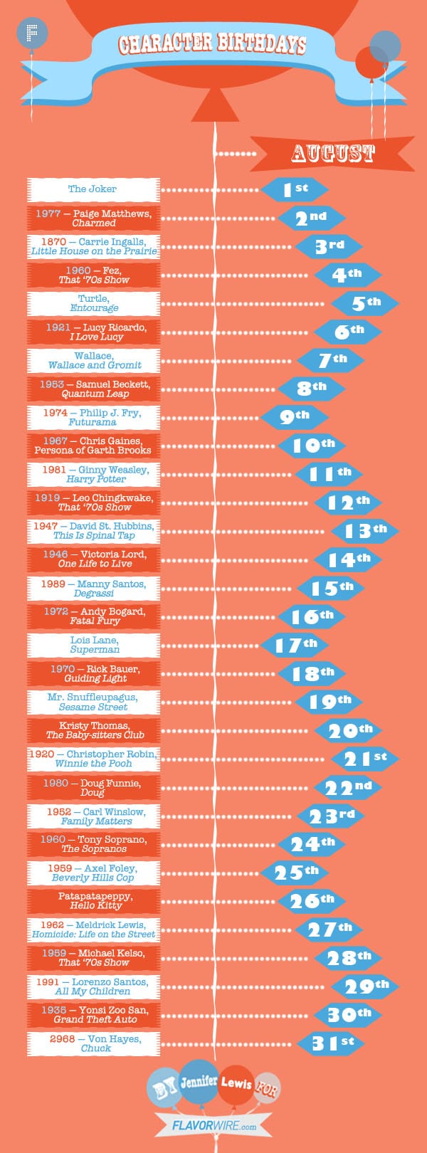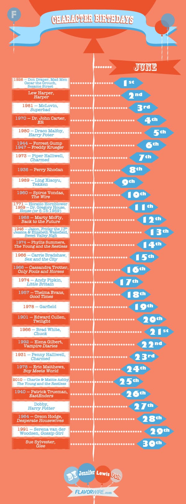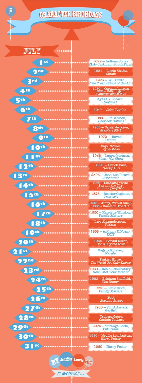 In any case, if you’re looking to rush to the calendar so you can brag about the awesome characters you’re related to (or bury the link with shame and never speak of it again), you can find the original infographic, called Character Birthdays, on Flavorwire’s website here. You can also check out the calendar for the next few months, if it pleases you. Enjoy!